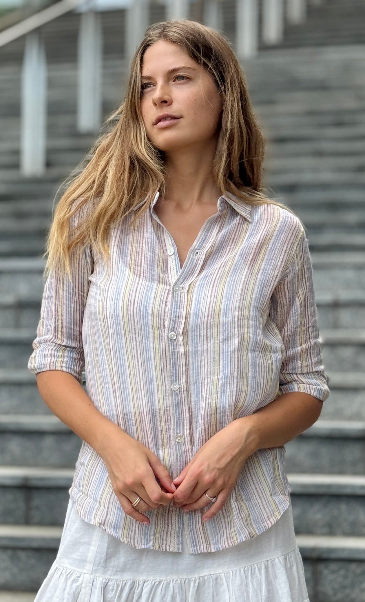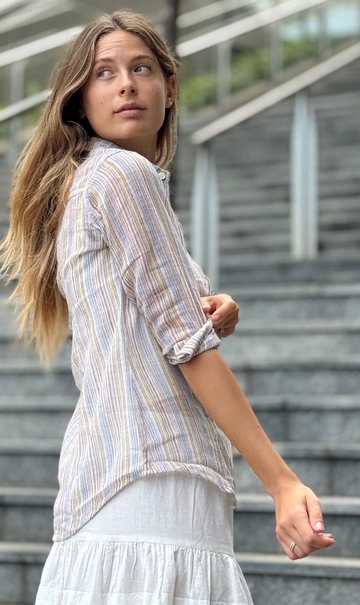 Camicia Donna in Cotone Garzato Tessuta a Mano – Multicolore a Righe, Maniche Lunghe, Bottoni in Conchiglia