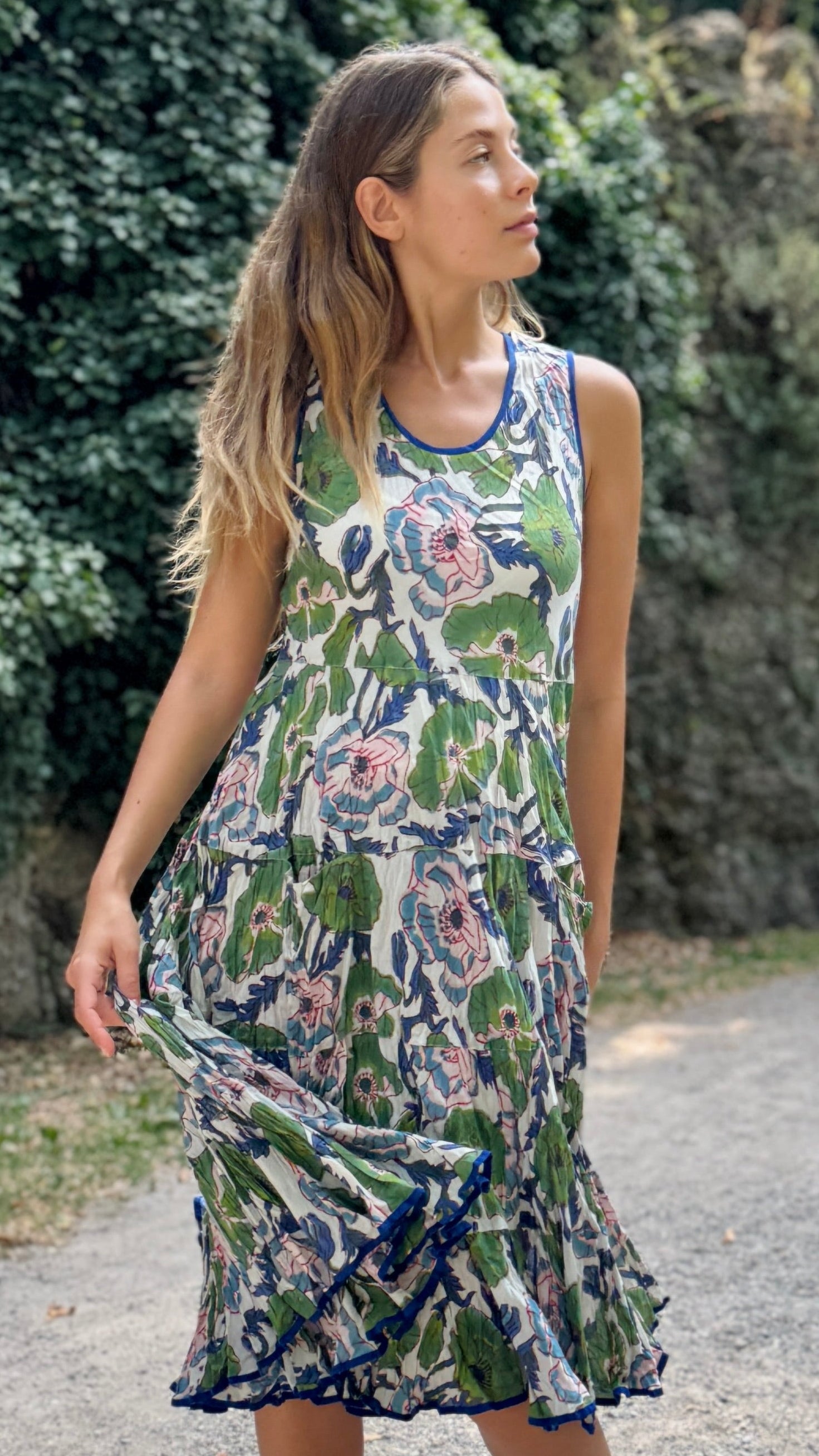 Questo abito lungo fino al ginocchio è realizzato in puro cotone indiano, stampato a mano con la tradizionale tecnica del block print, che rende ogni pezzo unico.