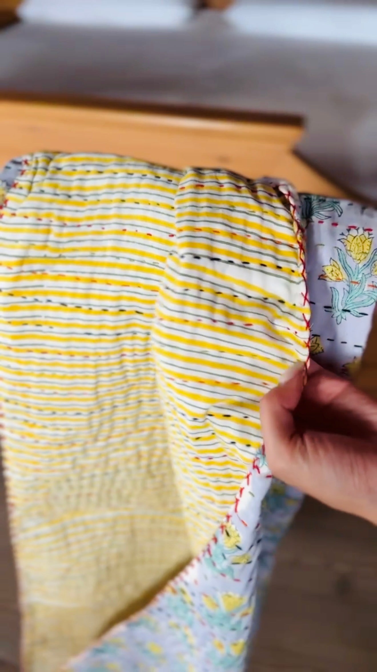 This gorgeous baby blanket is made of 100% natural Indian cotton , woven, printed, and embroidered entirely by hand by expert artisans. The light blue base, decorated with cheerful yellow flowers printed using the traditional block print technique, is enriched with precious details thanks to the multicolored kantha embroidery, which gives texture, warmth, and a unique touch to each piece.