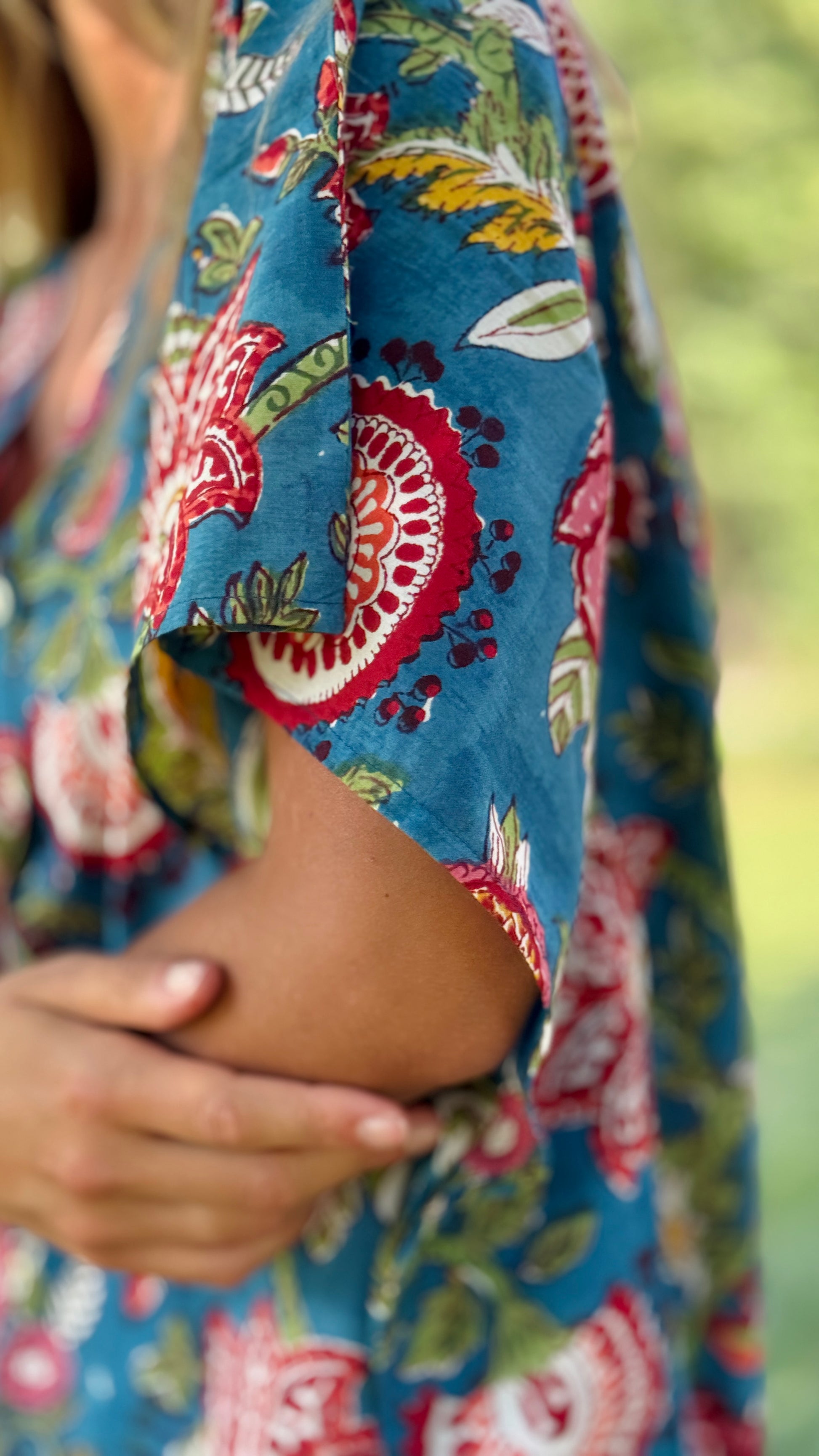 La stampa floreale ricca in tonalità azzurro, rosa e verde, realizzata con la tecnica artigianale del block print, dona al capo un fascino unico e raffinato.