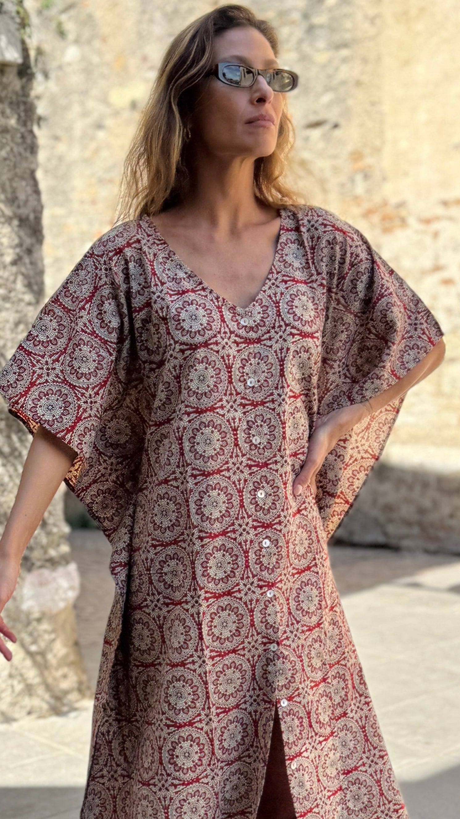 Scopri il fascino intramontabile del nostro caftano in cotone indiano filato e stampato a mano.