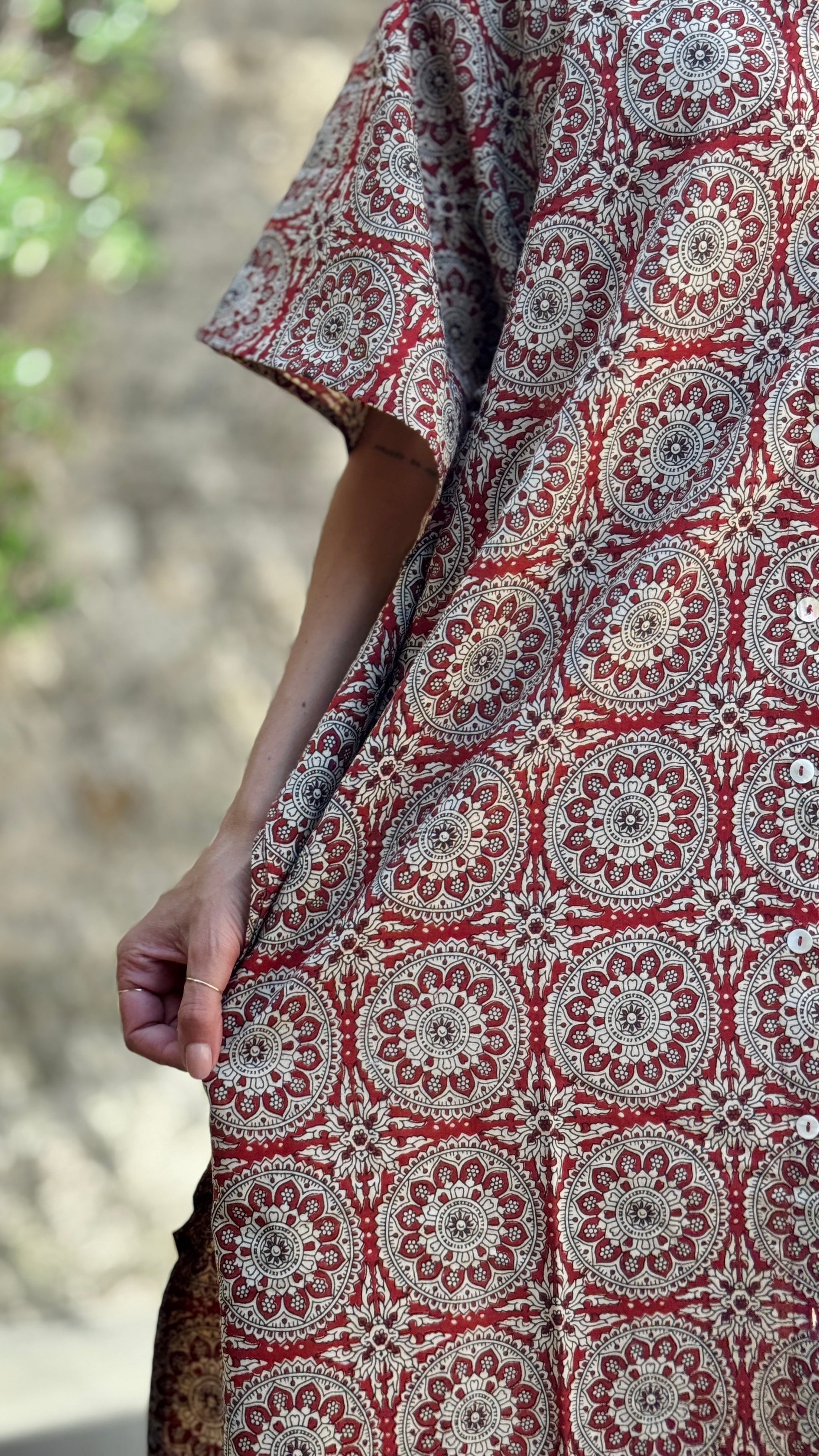 Caftano in Cotone Indiano Beige e Rosso con Stampa Block Print Geometrica – Eleganza Free Size