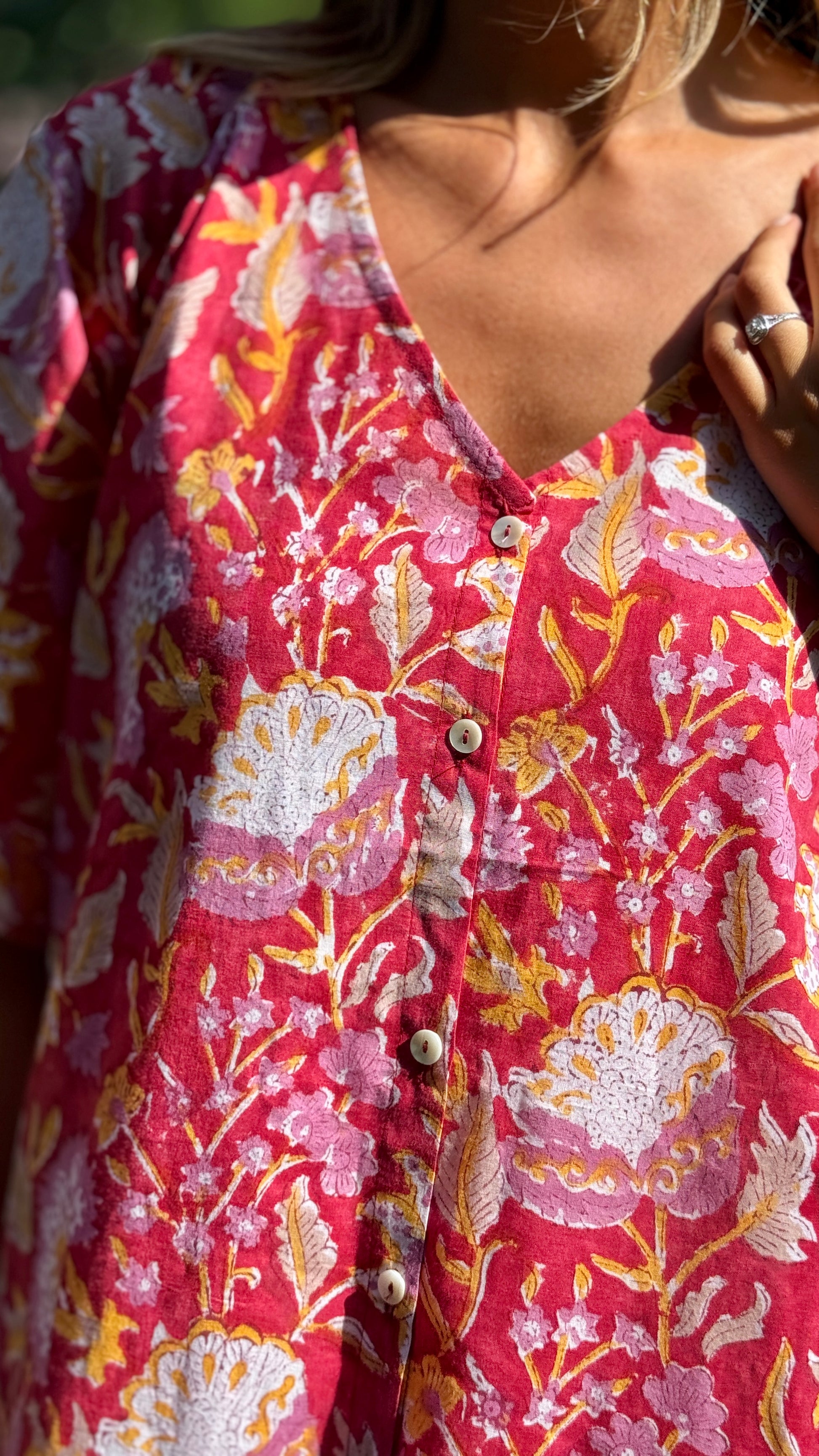 Caftano in Cotone Indiano Rosso Rosa Bianco e Arancio – Stampa Block Print Floreale Artigianale