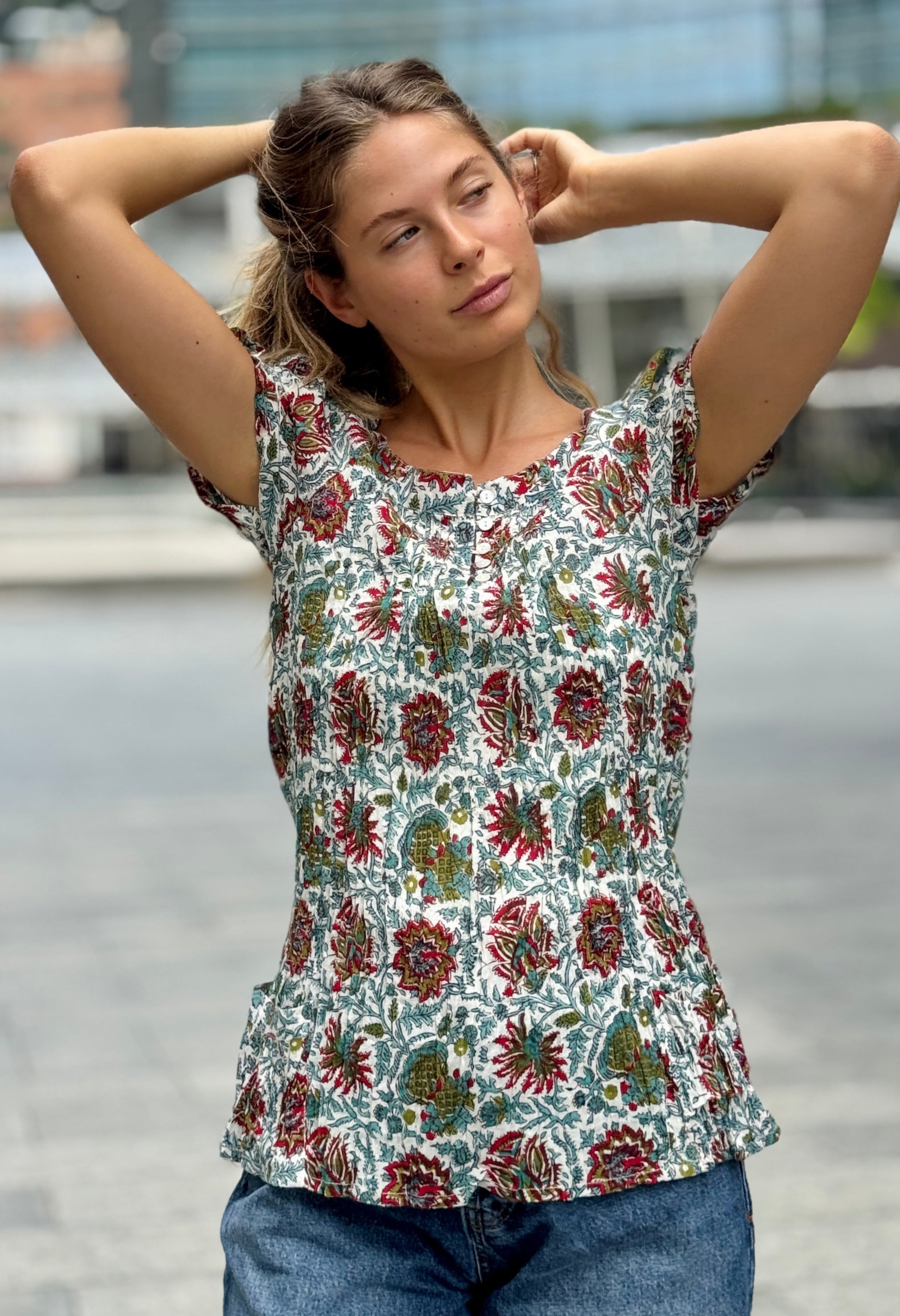 Questa camicia è confezionata in puro cotone indiano, morbido e traspirante, stampato a mano con la tecnica ancestrale del block print. La base bianca pura si anima di un delicato motivo floreale: fiori in rosso rubino intenso e foglie verde smeraldo, per un contrasto di colori vivace ma equilibrato.