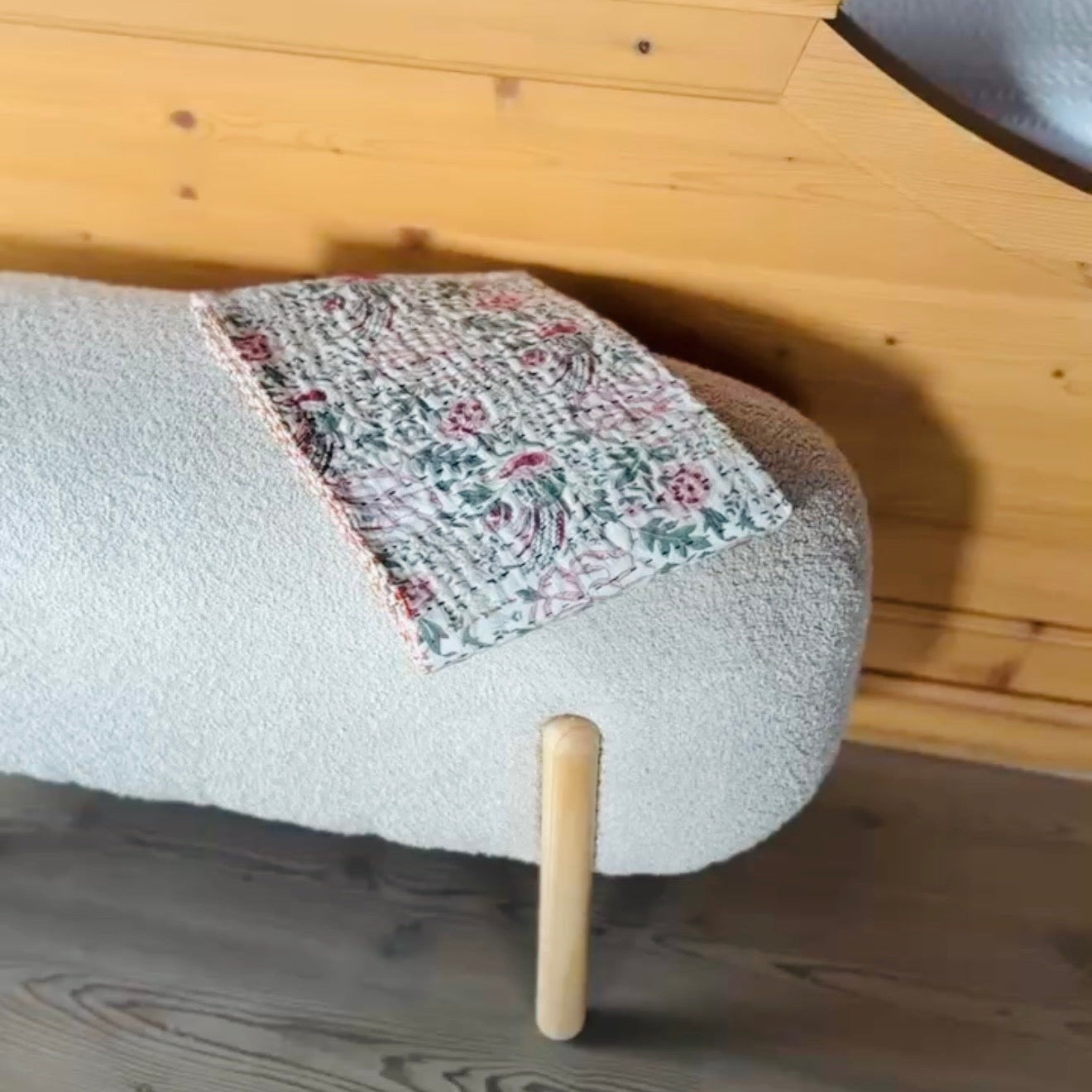 The multicoloured pattern, rich in floral motifs and natural details typical of Indian art, is created with the traditional block print technique, while the multicoloured kantha embroidery adds texture, warmth and uniqueness, transforming each blanket into a unique work of textile art.
